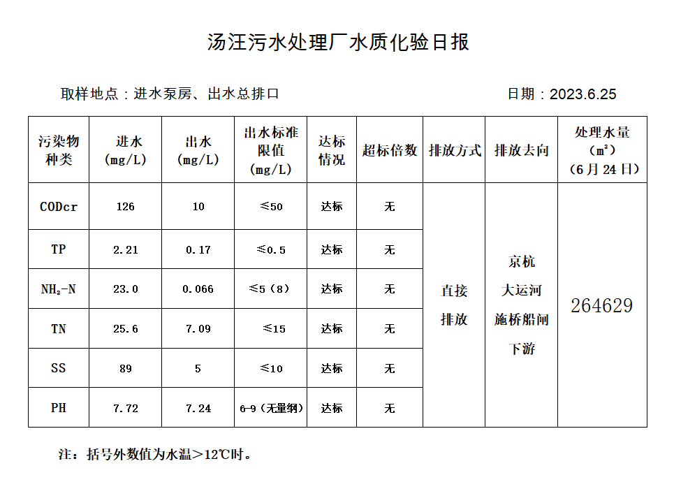 汤汪污水处理厂水质化验日报(2023.6.25)