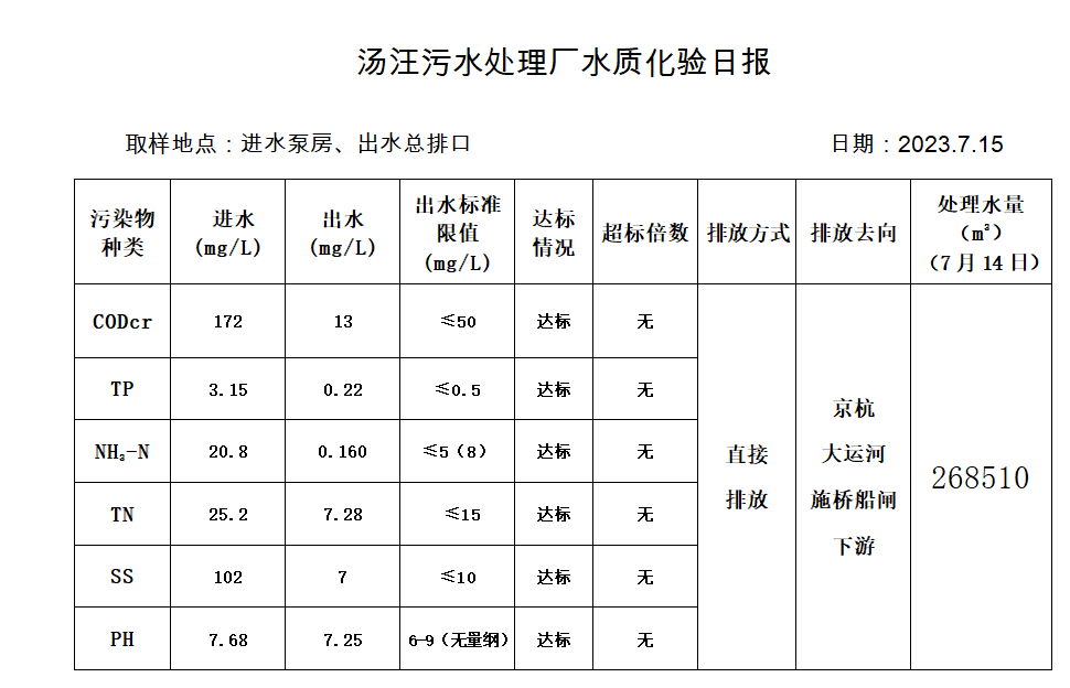 汤汪污水处理厂水质化验日报(2023.7.15)