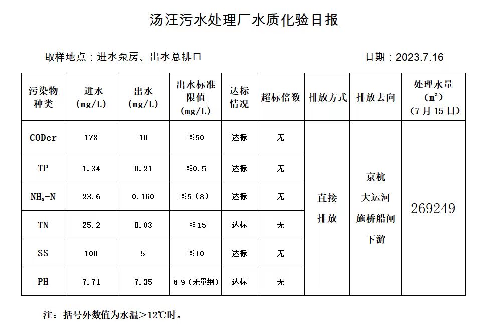 汤汪污水处理厂水质化验日报(2023.7.16)