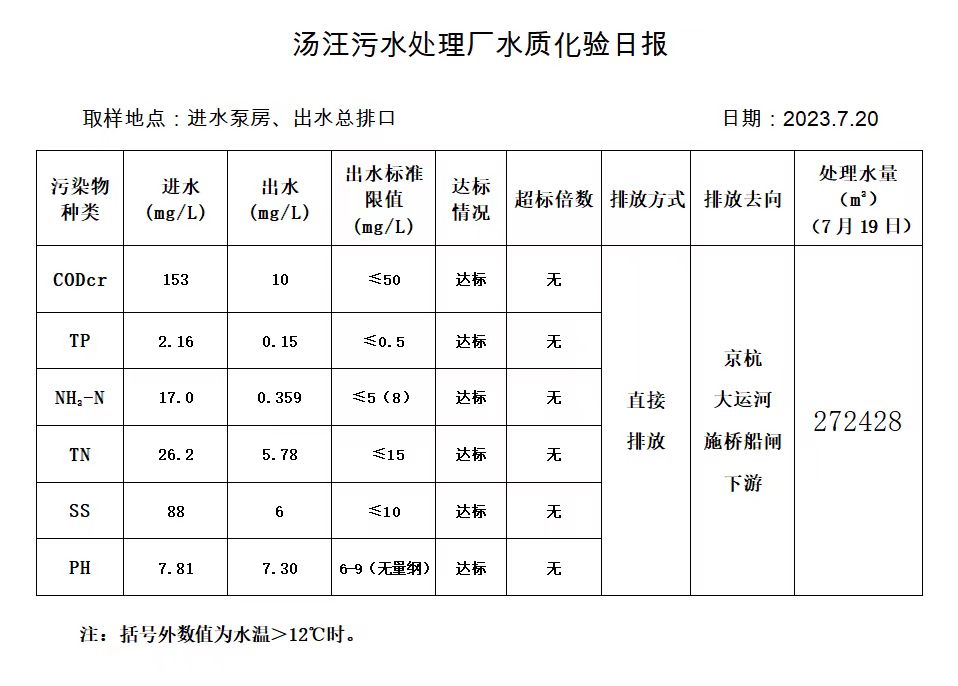 汤汪污水处理厂水质化验日报(2023.7.20)