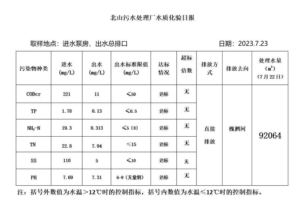 北山污水处理厂水质化验日报(2023.7.23)