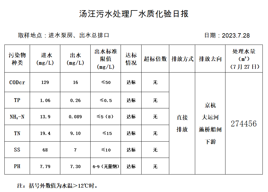 汤汪污水处理厂水质化验日报(2023.7.28)