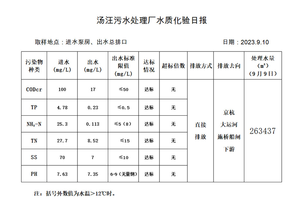 汤汪污水处理厂水质化验日报(2023.9.10)