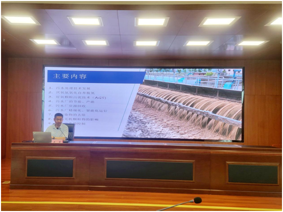 培训邀请了扬州大学环境科学与工程学院副院长、教授吴军进行授课。吴教授从厌氧氨氧化自养脱氮、好氧颗粒污泥技术 (AGS)、污水厂的节能, 产能、污水厂资源回收、污水厂精细化,智能化运行、新污染物的去除、进水无机颗粒物的影响和溢流污染的控制等多个方面对污水处理技术进行了生动讲解,并为技术人员答疑解惑,现场研学氛围浓厚。