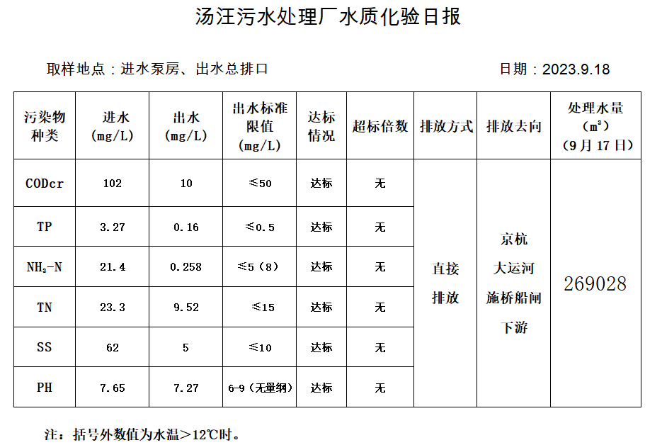 汤汪污水处理厂水质化验日报(2023.9.18)