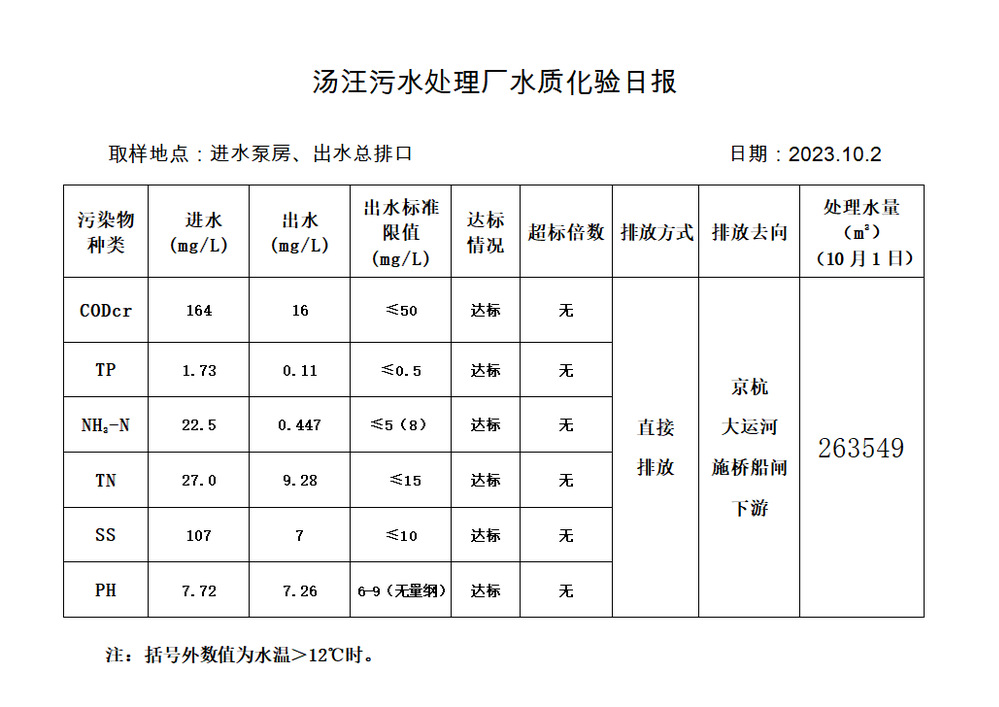 汤汪污水处理厂水质化验日报(2023.10.2)