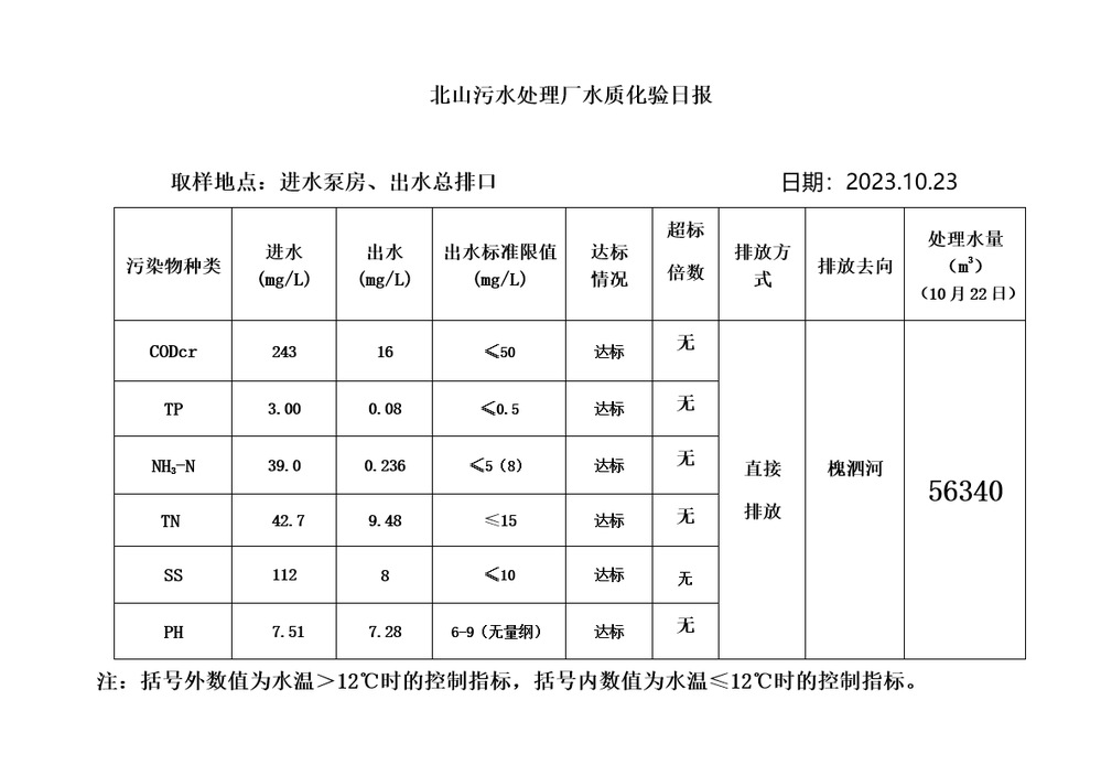 北山污水处理厂水质化验日报(2023.10.23)