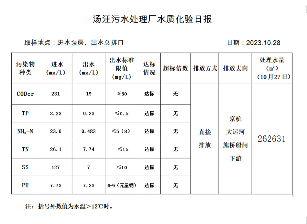 汤汪污水处理厂水质化验日报(2023.10.28)