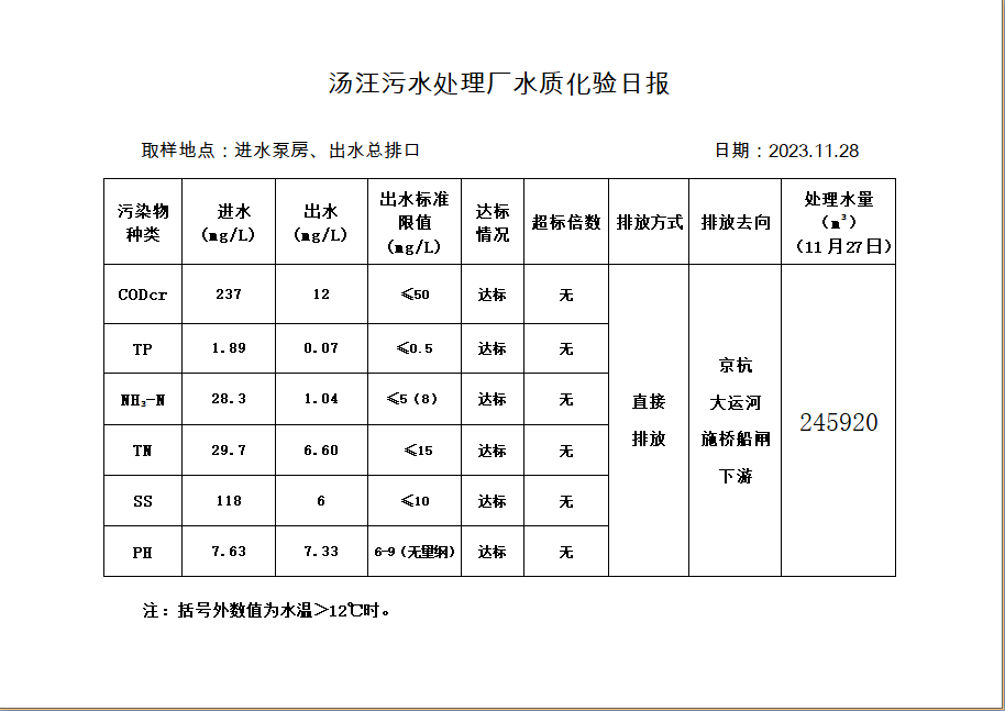 汤汪污水处理厂水质化验日报(2023.11.28)