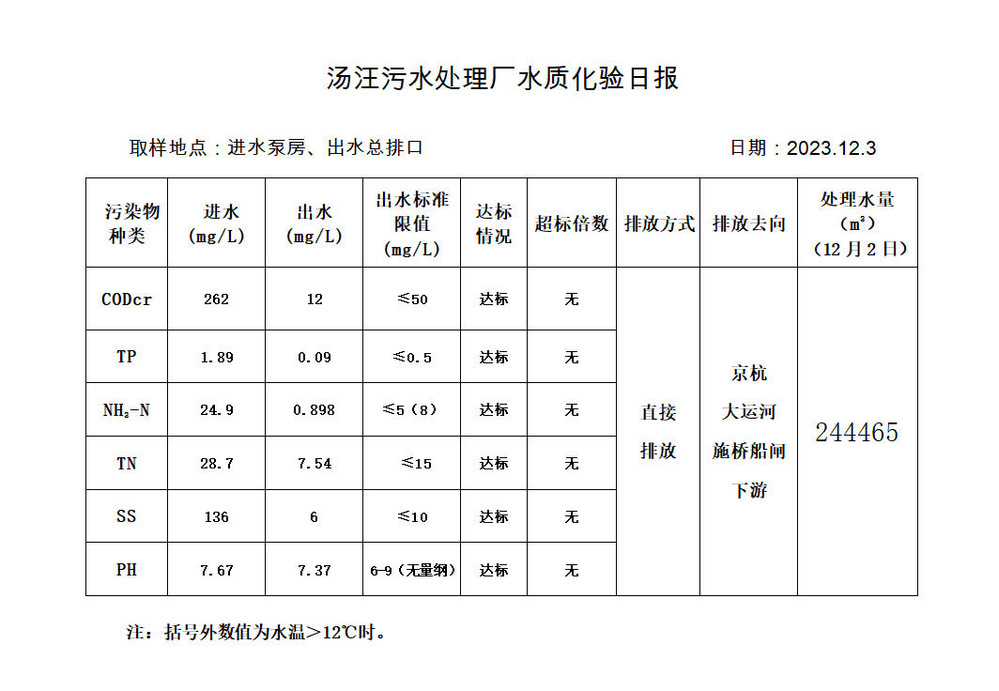 汤汪污水处理厂水质化验日报(2023.12.3)