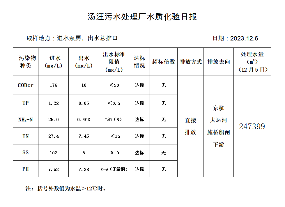 汤汪污水处理厂水质化验日报(2023.12.6)