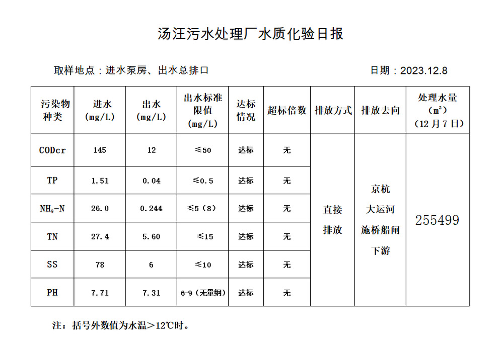 汤汪污水处理厂水质化验日报(2023.12.8)