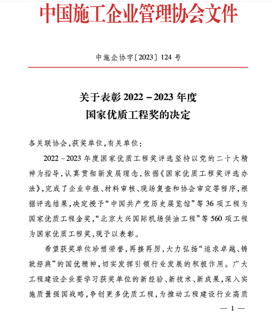 国家优质工程奖设立于1981年,倡导“追求卓越、铸就经典”的精神理念,评定注重工程质量的全面、系统管理,是经国务院确认的我国工程建设领域设立最早,规格最高,跨行业、跨专业的国家级质量奖。