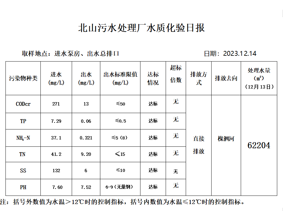 北山污水处理厂水质化验日报(2023.12.14)