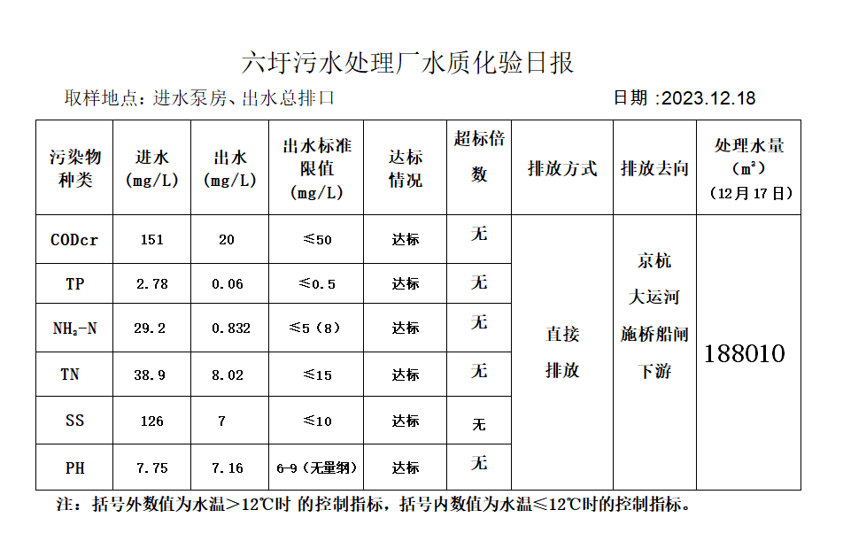 六圩污水处理厂水质化验日报(2023.12.18)