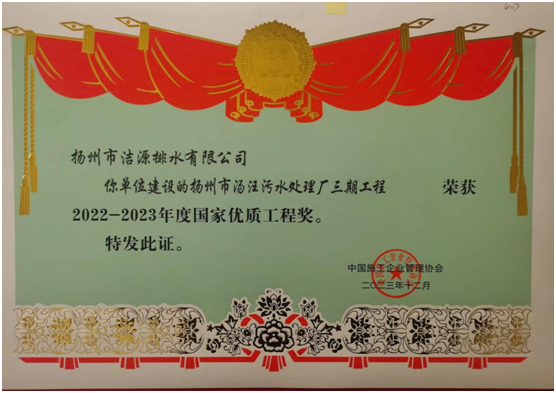 12月24日,2022-2023年度国家优质工程奖总结表彰大会在北京会议中心召开。扬州洁源环境股份有限公司汤汪污水处理厂三期工程项目相关代表赴京领奖。