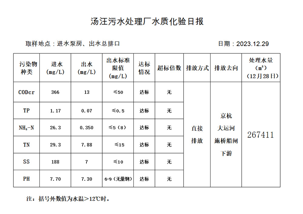 汤汪污水处理厂水质化验日报(2023.12.29)