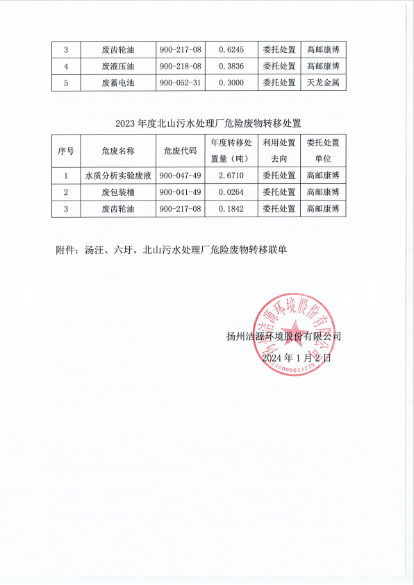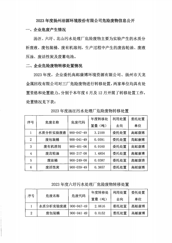 2023年度扬州洁源环境股份有限公司危险废物信息公开