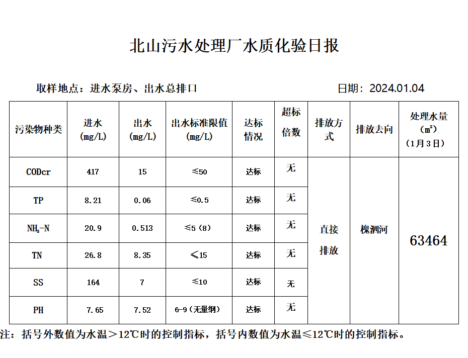 北山污水处理厂水质化验日报(2024.1.4)