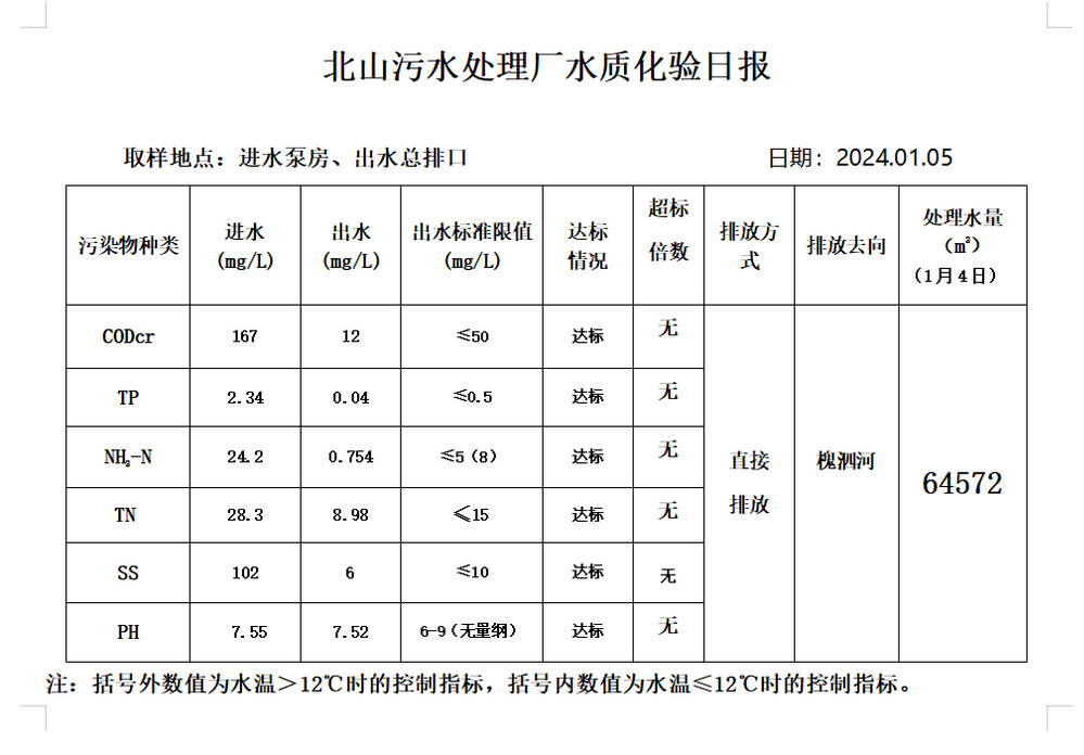 北山污水处理厂水质化验日报(2024.1.5)