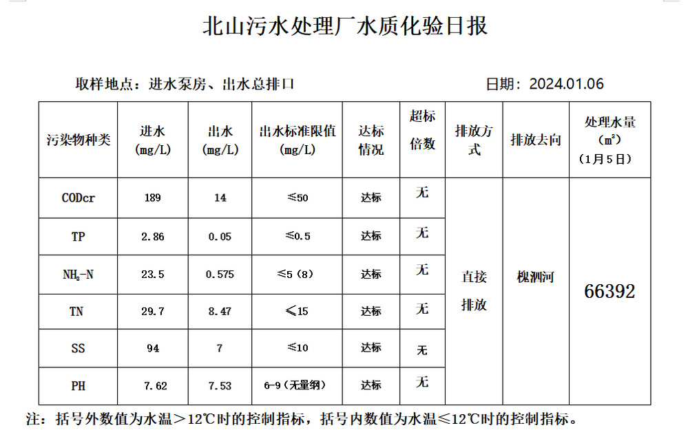 北山污水处理厂水质化验日报(2024.1.6)