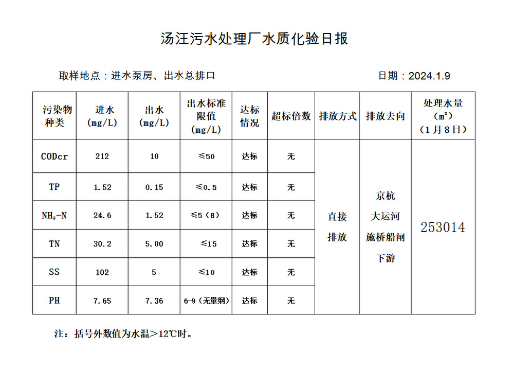 汤汪污水处理厂水质化验日报(2024.1.9)