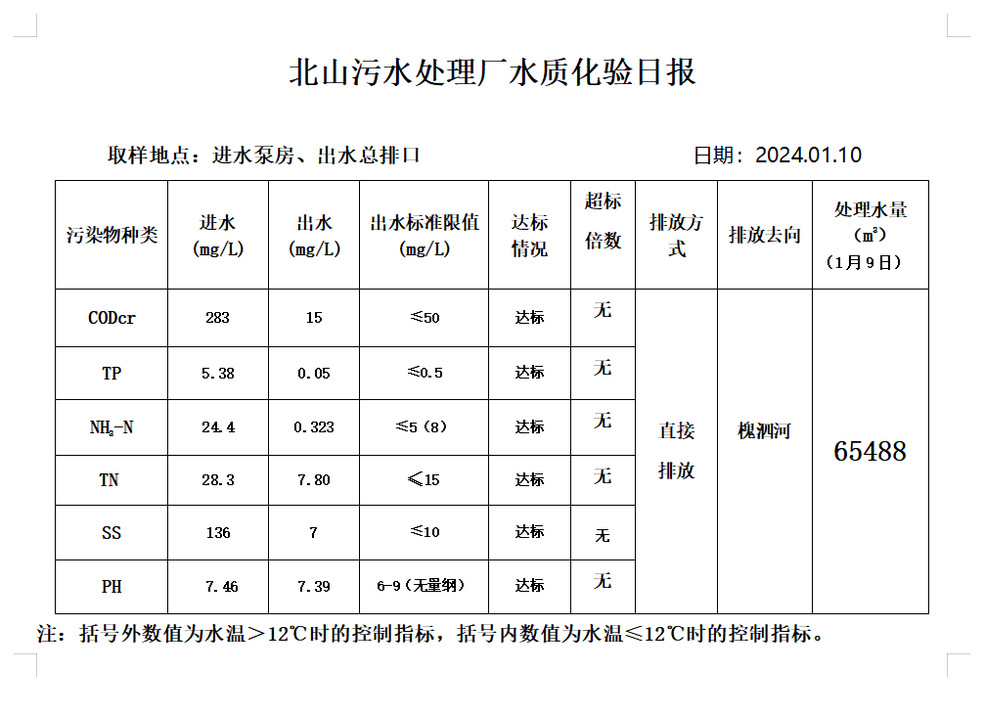 北山污水处理厂水质化验日报(2024.1.10)
