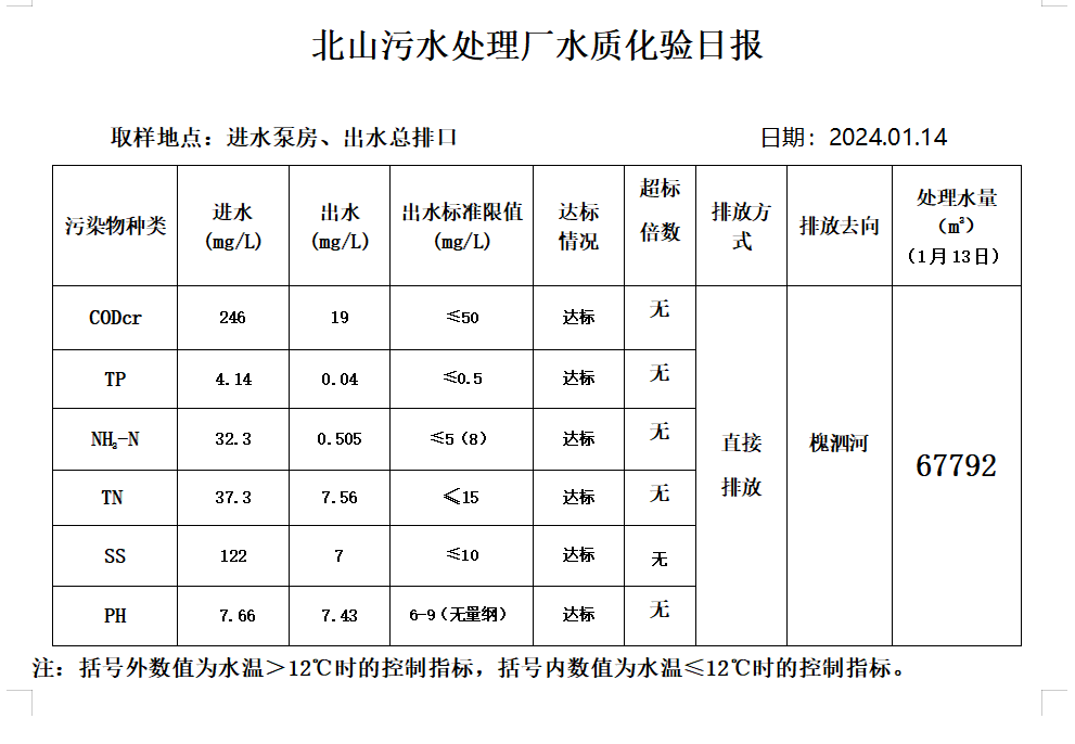 北山污水处理厂水质化验日报(2024.1.14)
