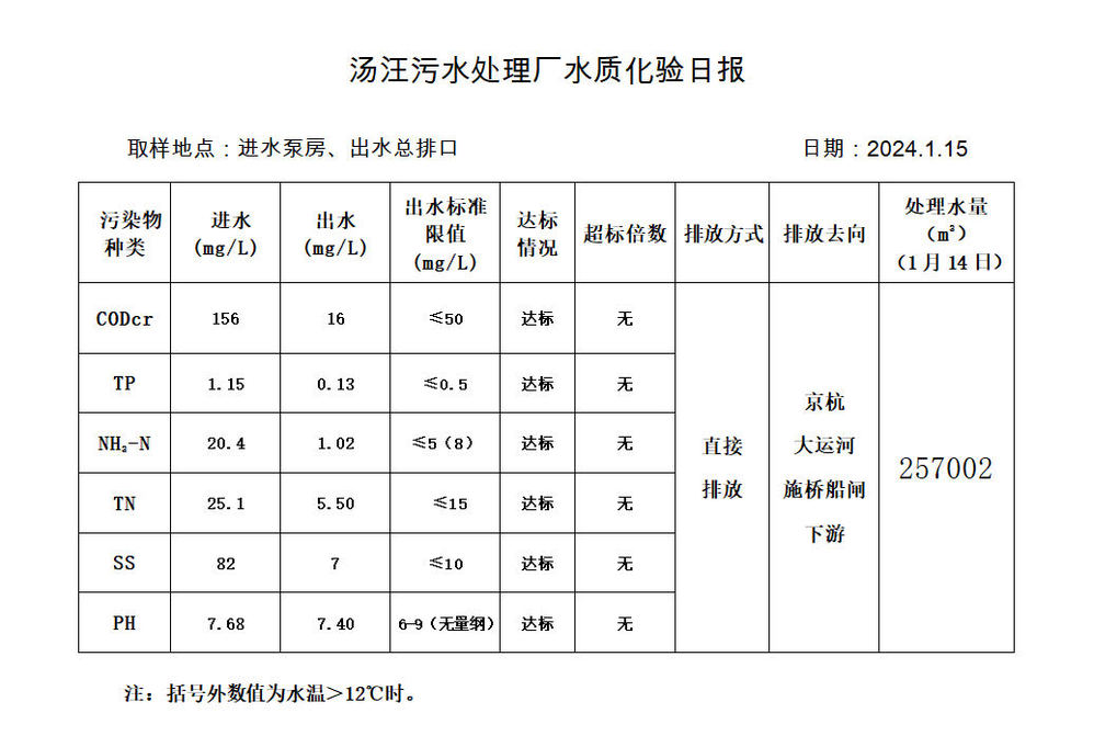 汤汪污水处理厂水质化验日报(2024.1.15)