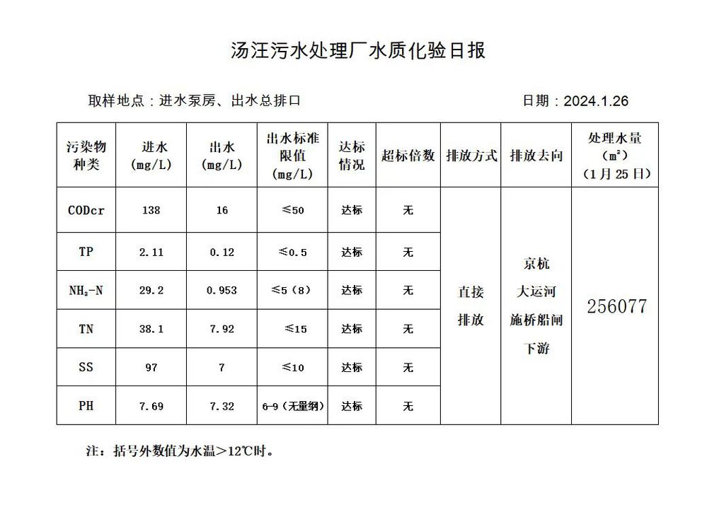 汤汪污水处理厂水质化验日报(2024.1.26)