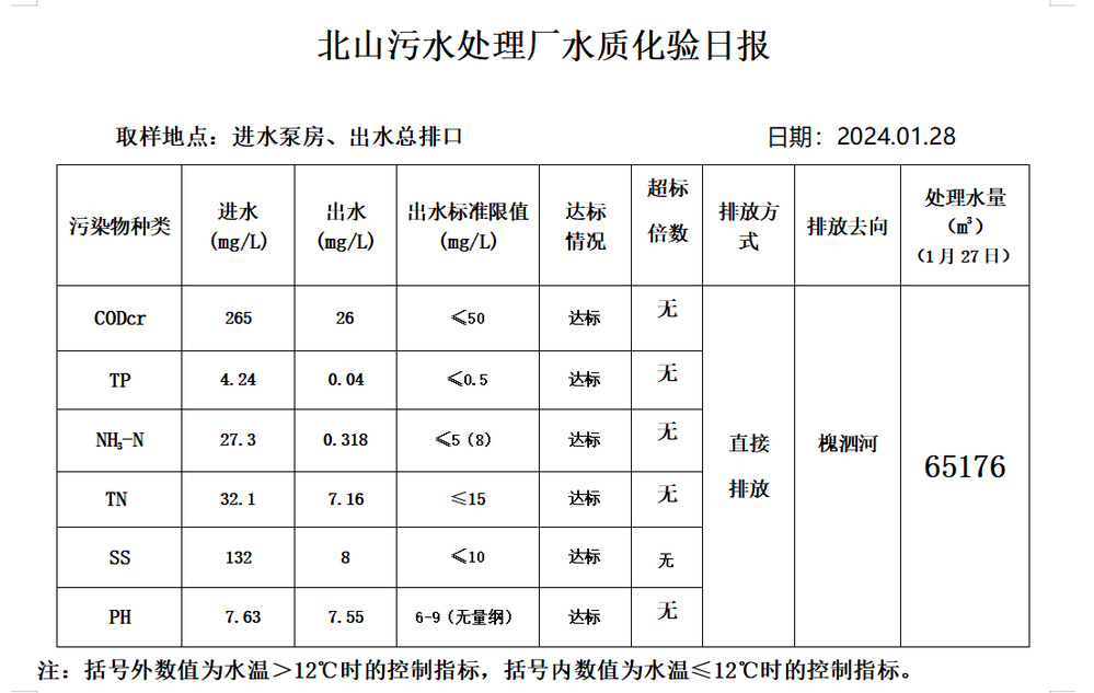 北山污水处理厂水质化验日报(2024.1.28)
