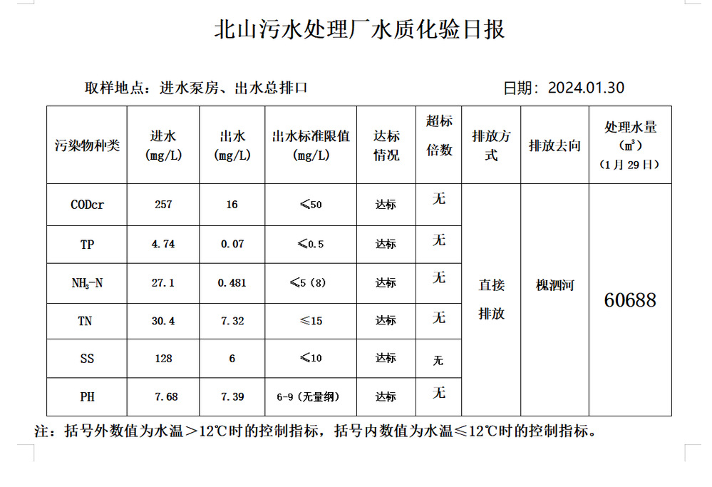 北山污水处理厂水质化验日报(2024.1.30)