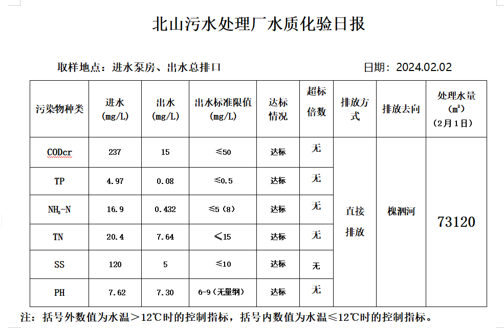 北山污水处理厂水质化验日报(2024.2.2)
