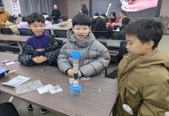 在社区的多功能厅,环保讲师以古代污水处理技术的演变迭代为主题,用生动的幻灯片和净水系统实验器材,给孩子们开展了一堂污水处理净化过程的专题课。在互动环节,同学们带着好奇求知的心争先恐后地抢答讲师提出的节水技巧问题,讲师有针对性的给小朋友们逐一讲解,志愿者也为孩子们送出了精美的手工礼物。