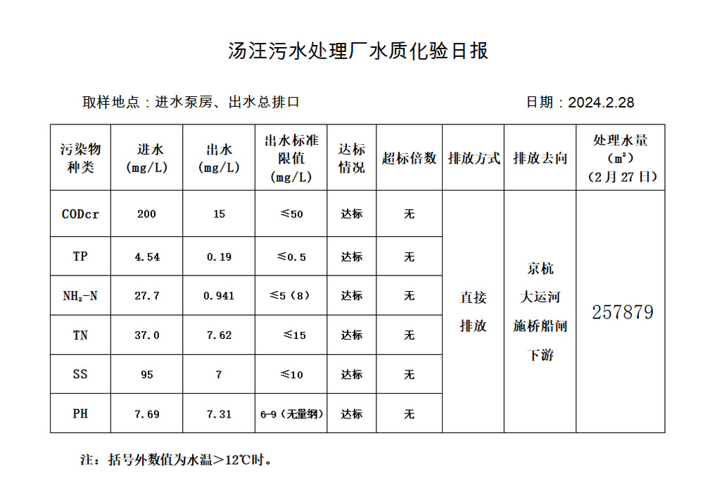 汤汪污水处理厂水质化验日报(2024.2.28)