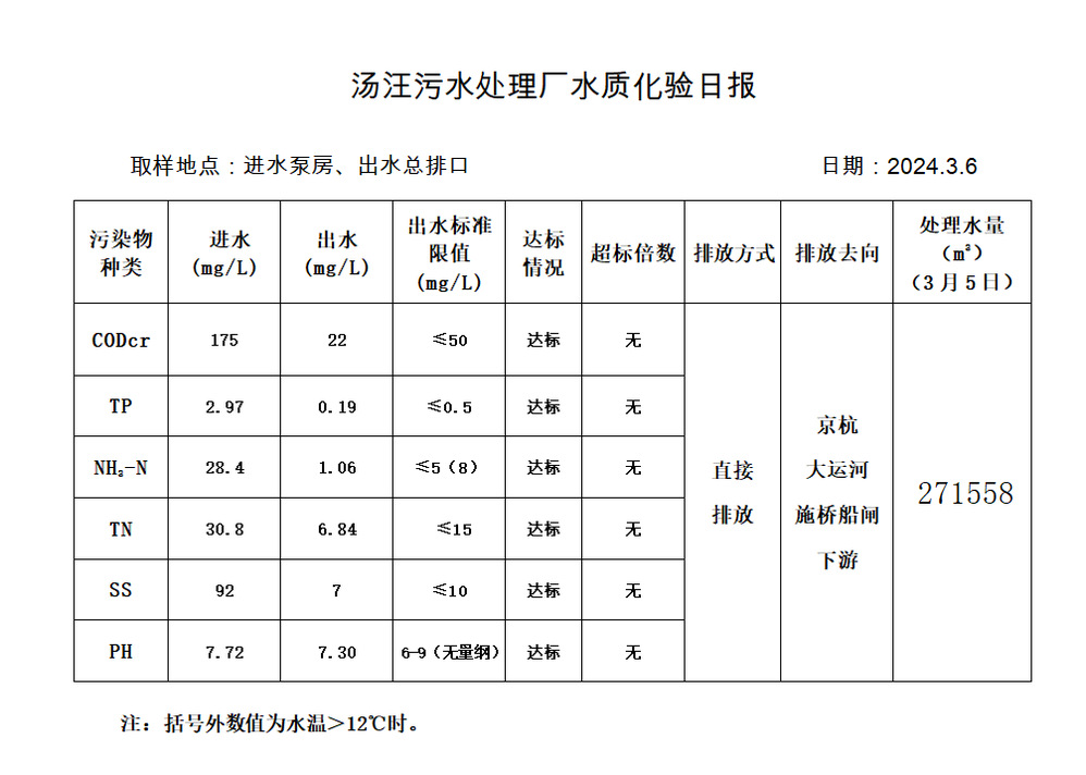 汤汪污水处理厂水质化验日报(2024.3.6)