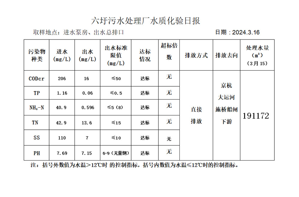 六圩污水处理厂水质化验日报(2024.3.16)