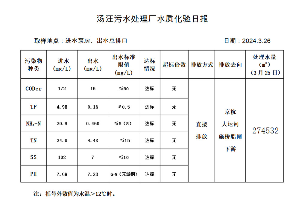 汤汪污水处理厂水质化验日报(2024.3.26)