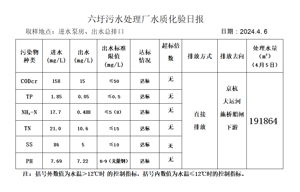 六圩污水处理厂水质化验日报(2024.4.6)