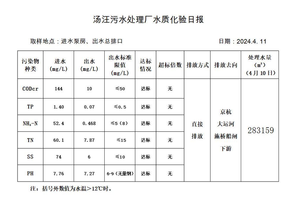 汤汪污水处理厂水质化验日报(2024.4.11)