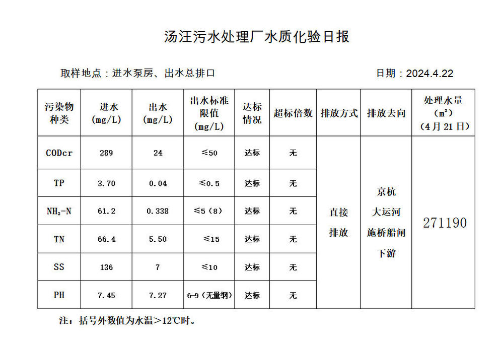 汤汪污水处理厂水质化验日报(2024.4.22)