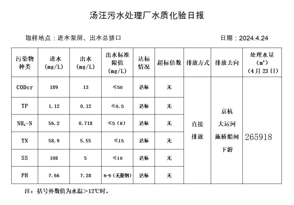 汤汪污水处理厂水质化验日报(2024.4.24)