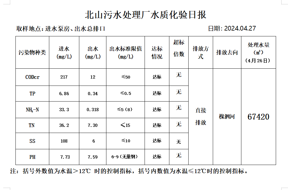 北山污水处理厂水质化验日报(2024.4.27)