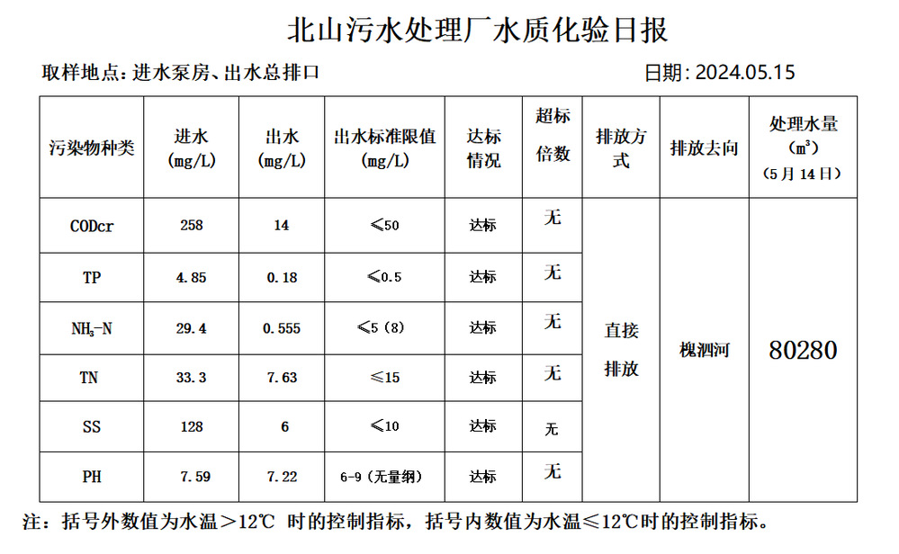 北山污水处理厂水质化验日报(2024.5.15)