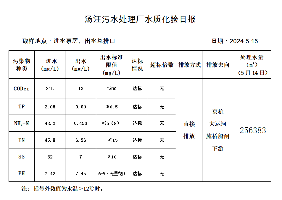 汤汪污水处理厂水质化验日报(2024.5.15)