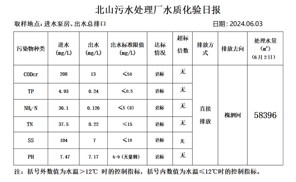 北山污水处理厂水质化验日报(2024.6.3)