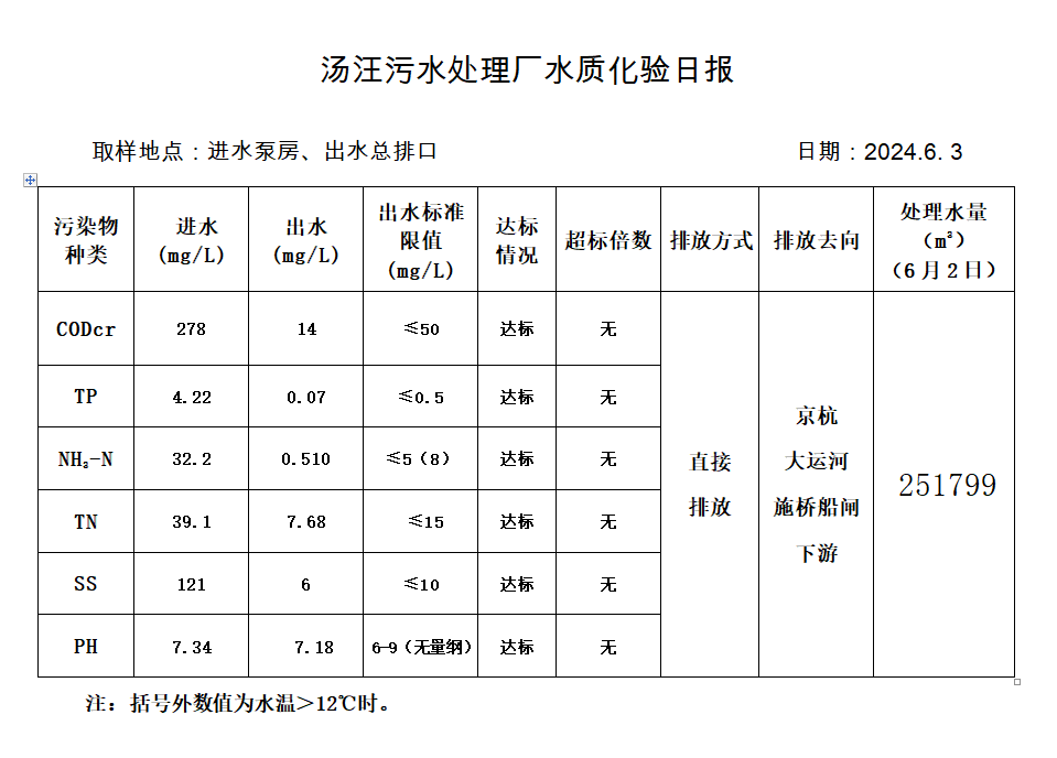 汤汪污水处理厂水质化验日报(2024.6.3)