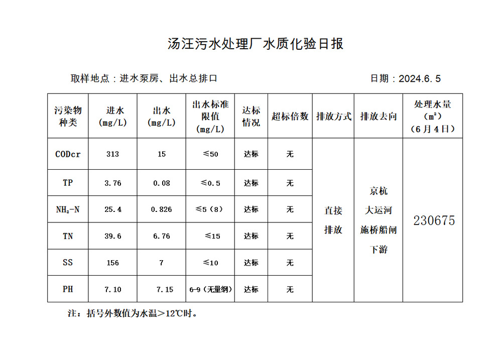 汤汪污水处理厂水质化验日报(2024.6.5)