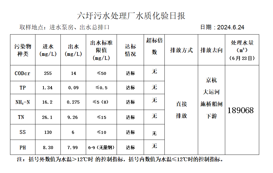 六圩污水处理厂水质化验日报(2024.6.24)