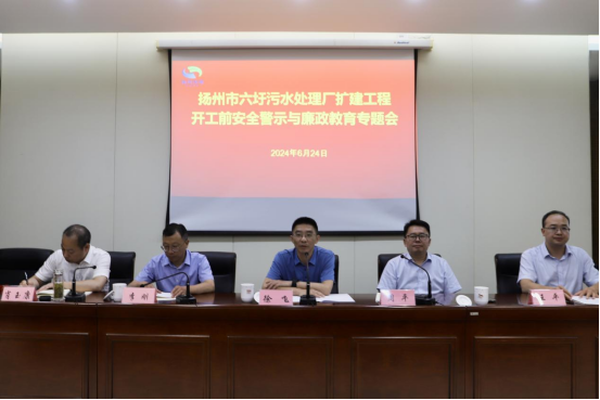 为确保六圩污水处理厂扩建工程顺利开工建设,做好工程建设期间的廉政工作,打造优质工程与廉洁工程,6月24日下午扬州洁源环境股份有限公司召开一期安全警示与廉政教育专题会。城控集团党委副书记徐飞、副总经理周平、企管部副部长李刚、洁源环境公司领导班子成员、驻项目安全管理人员、参建单位分管负责人和项目安全管理人员参会。